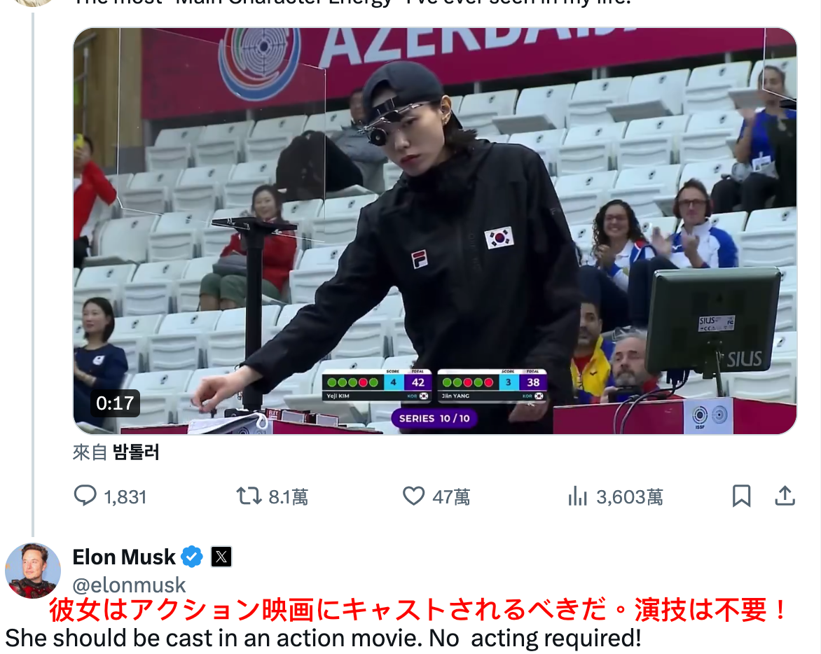 2024年パリオリンピックで韓国は射撃で素晴らしい成績を収め、女子10メートルエアピストルで金メダルと銀メダルを獲得しました。銀メダリストの김예지(キム・イェジ)は、5月の試合の映像が再び注目を集め、冷酷な表情が世界中で話題になりました。テスラのCEOイーロン・マスクも「彼女はアクション映画に出演すべきだ。演技は不要!」と言っています。